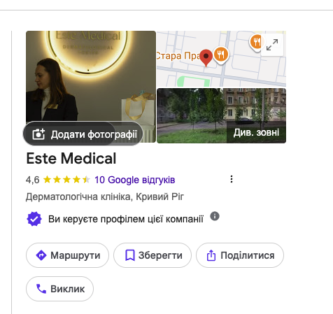 • Реєстрація та верифікація: Створили офіційну точку EsteMed, пройшли підтвердження та налаштували категорію «Центр естетичної медицини».