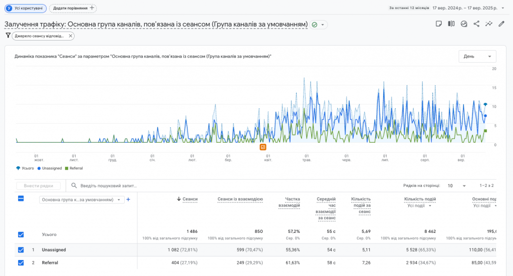 1. Відкриваю GA4 (https://analytics.google.com) → Джерела трафіку > Залучення трафіку